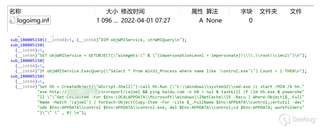 cajview393434logo.cab為上述CVE-2021-40444漏洞利用的二階樣本,cab文件內的logoinmg.inf為一個下載器從http://xxx.xxx.xxx.xxx/srvreport/cajxml下載三階樣本。
