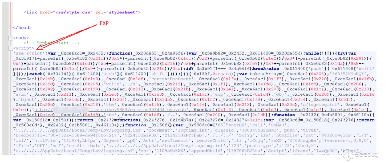 formupdate8976.php頁面內置一段JS腳本,腳本內容為CVE-2021-40444漏洞利用代碼,用于加載執行二階程序http://xxx.xxx.xxx.xxx/jiansurvey/cajview393434logo.cab。