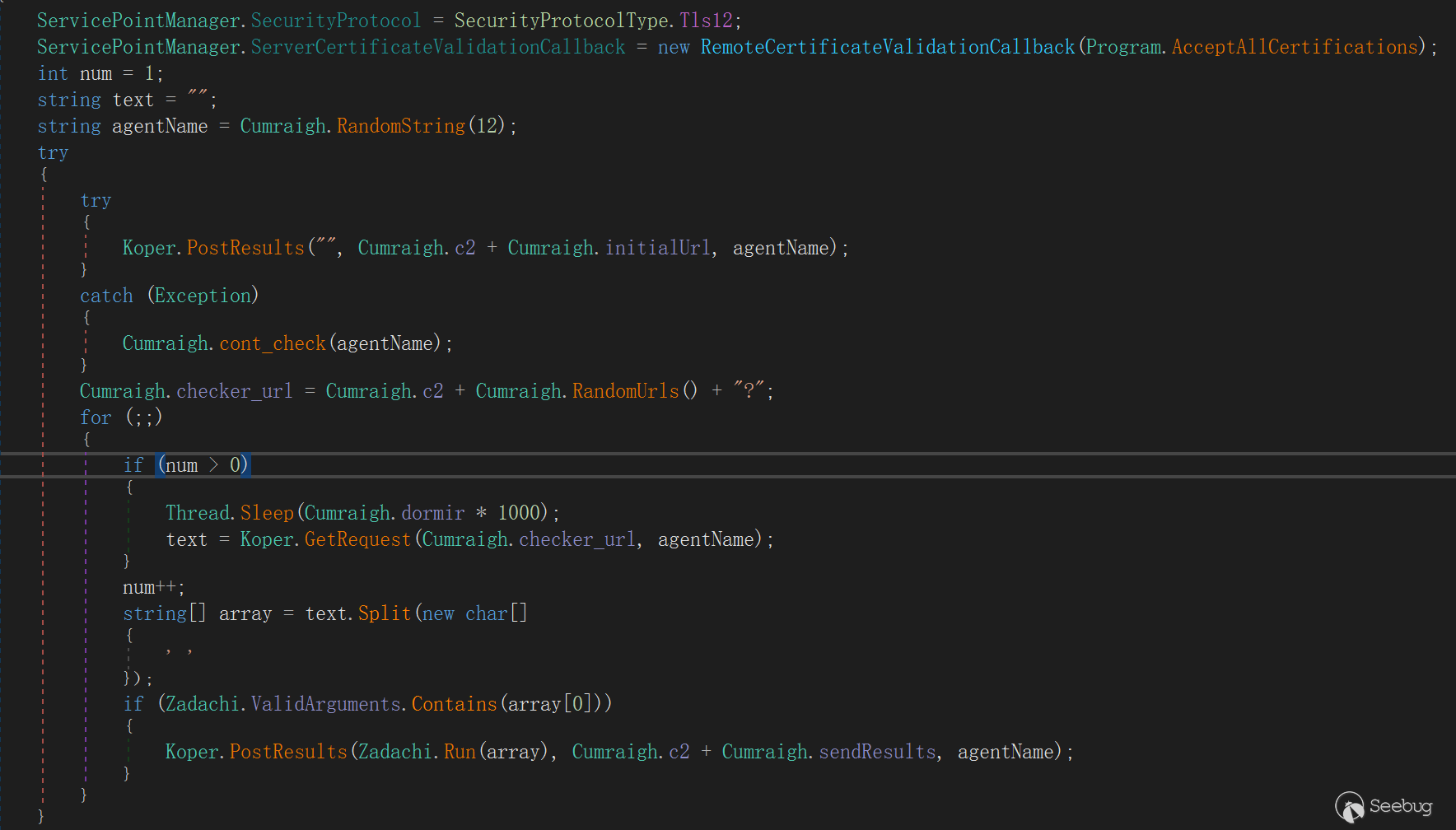 樣本會強制使用HTTPS(TLS1.2),當C&C為Http時則會退出。樣本運行首先隨機生成一個長度為12字節的ClientID,ClientID生成方式為從A-Z0-9范圍隨機選取12個字母或數字,生成ClientID后嘗試將ClientID發送到初始URL "https://xxx.xxx.xxx.xxx/jquery.js" Post,數據加密方式為XOR(KEY: "o")+Base64。