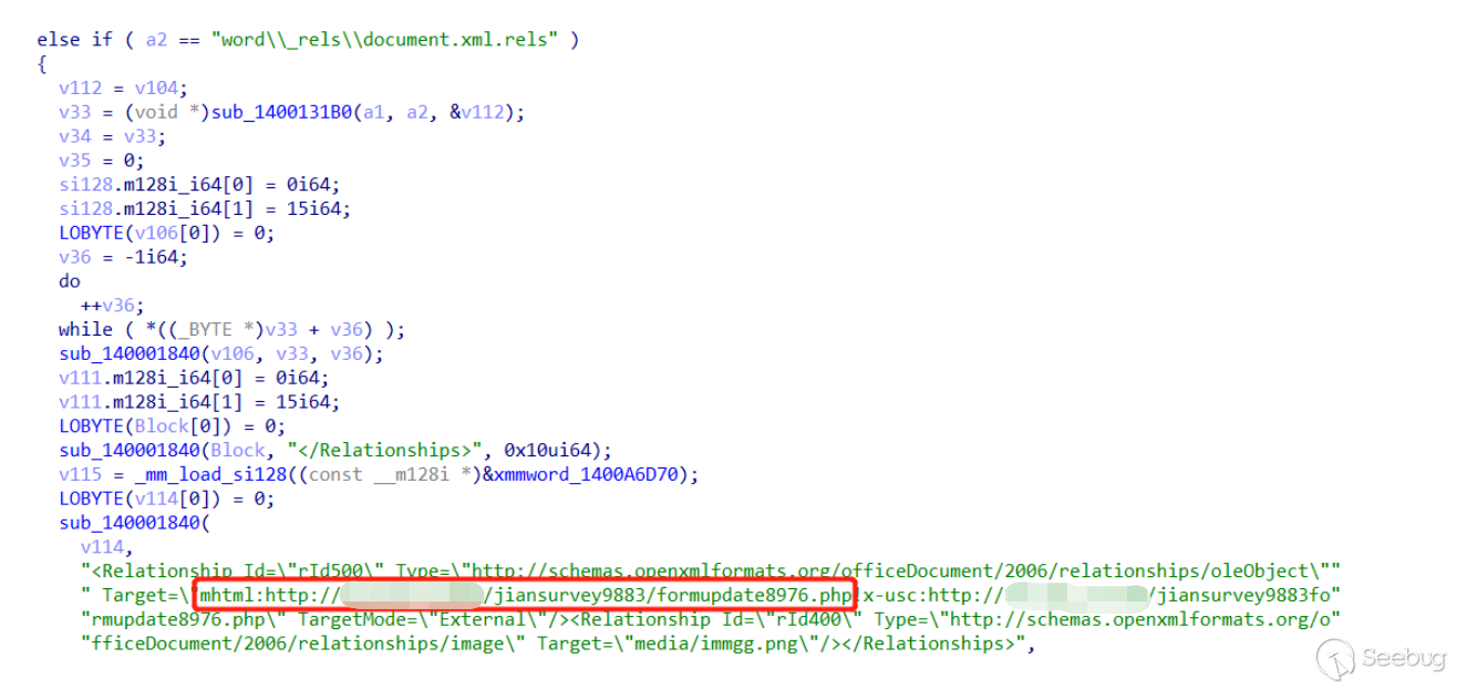 通過COM接口IPersistFile::GetPath來獲取快捷方式文件對應的docx文件路徑,將文件拷貝至%Temp%\DCX_tmp\目錄下,然后將文件解zip包,向其中的document.xml.rels配置文件中注入遠程模板鏈接hxxp://xxx.xxx.xxx.xxx/jiansurvey/formupdate8976.php,然后將文檔重新打包并替換原始文件。